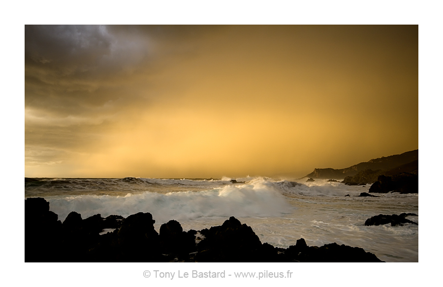 |  Un orage de neige approche la presqu'île de la Parata (Corse - 11/02/2009).
